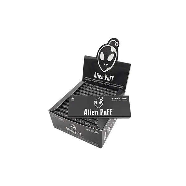 Introducing the Alien Puff 4-in-1 Kingsize Brown Papers, Filter Tips, Rolling Tray & Grinder (HP2401-AP), the ultimate all-in-one solution for rolling enthusiasts. This comprehensive kit offers everything you need for a perfect roll, all conveniently packaged in one sleek set. Each pack includes 12 sets of booklets, each set containing 50 unbleached, natural rolling papers and 50 filter tips with a convenient rolling tray and grinder, making it easy to have everything you need in one convenient package. The kingsize brown papers are crafted from high-quality, unbleached materials, ensuring a smooth and natural smoking experience. The included filter tips help create a more comfortable draw and reduce waste. The rolling tray provides a clean, stable surface for preparation, while the grinder ensures your herbs are perfectly prepared for rolling. Whether you’re a seasoned roller or just starting out, the Alien Puff 4-in-1 kit offers unparalleled convenience and quality, making it the perfect choice for those who appreciate a well-crafted roll.