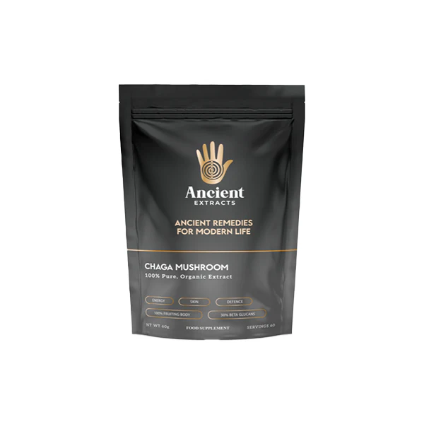 Introducing Ancient Extracts’ Organic Chaga Powder, a 60-gram powerhouse enriched with 30% beta-glucan. Carefully sourced from organically cultivated Chaga mushrooms, this premium dietary supplement exemplifies nature’s purity and efficacy. Meticulously crafted to the highest quality standards, Ancient Extracts guarantees a product that promotes overall well-being. Offering energy boosting properties. Elevate your health with this potent organic supplement, as Ancient Extracts invites you to embrace the benefits of Chaga – your gateway to holistic vitality.
